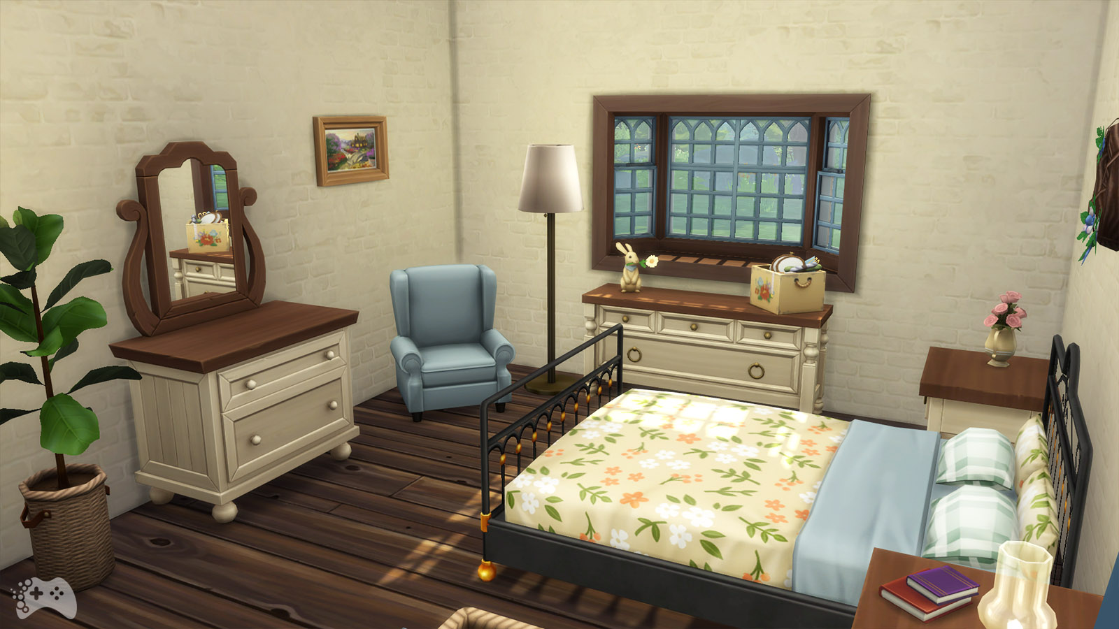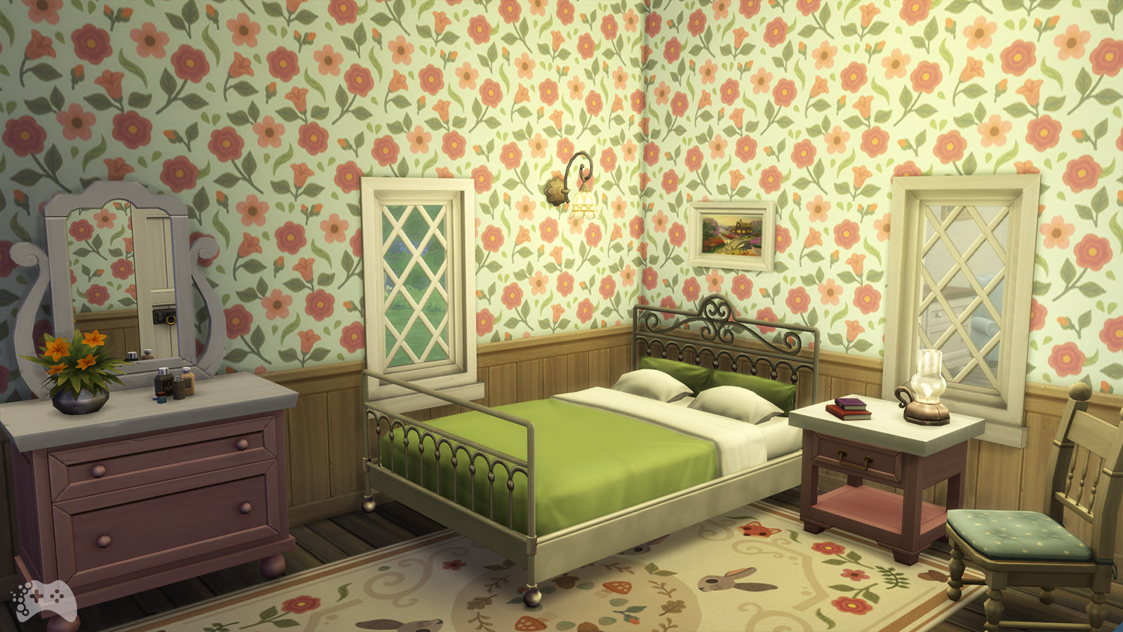 Dodatek The Sims 4 Wiejska sielanka wprowadza także kilka ciekawych obiektów do sypialni. Najważniejszym elementem jest oczywiście nowe łóżko o nazwie “Pensjonatowe” z metalową ramą. Do kompletu został dodany nowy stolik, komoda z lustrem oraz ozdobny zegar ścienny.